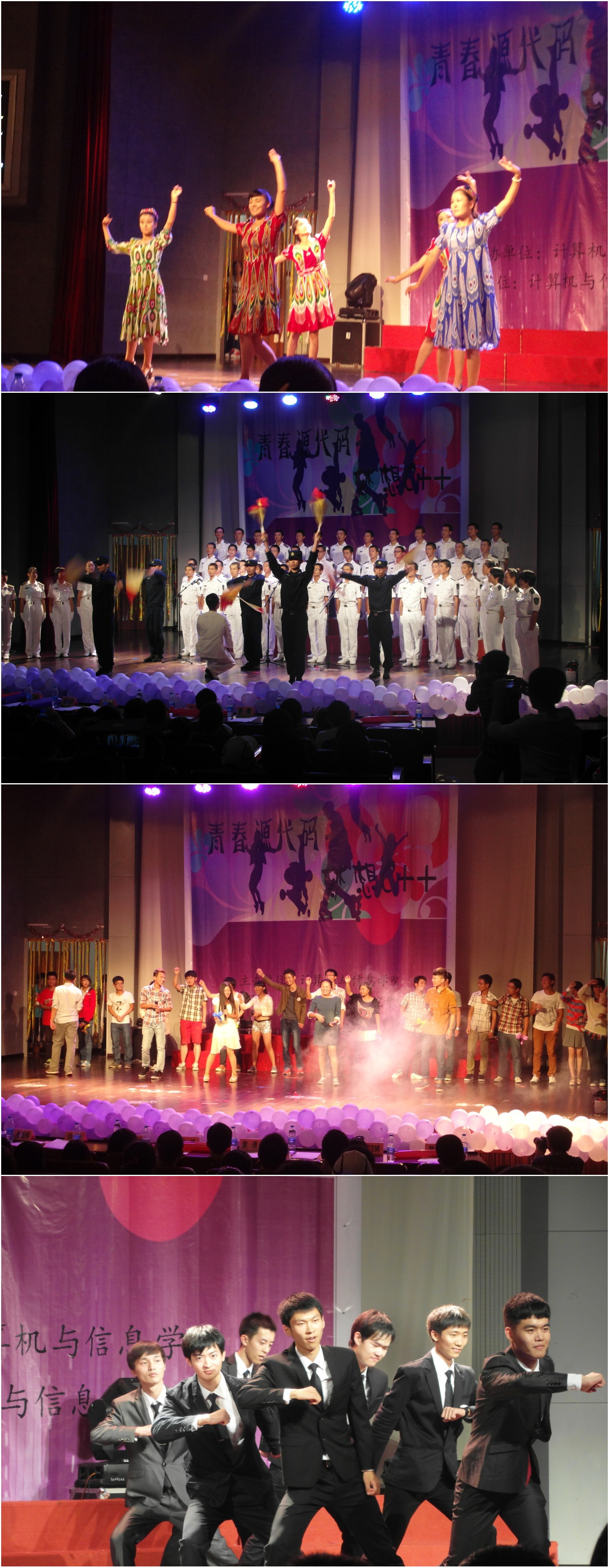 晚会由闪亮的爵士舞开场,舞者饱含激情的跳动彰显了学生们昂扬奔放的青春。手语的精彩表演、萨克斯演奏者精湛的技艺令同学们拍手叫绝。相声让同学们领略了语言艺术的魅力。雷人舞蹈《葫芦七兄弟》将正统与搞怪巧妙的结合在一起,给大家带来耳目一新的感觉,获得的新生的一致好评。大合唱《保卫钓鱼岛》展现了国防生们飒爽的英姿与嘹亮的歌声。2013级辅导员雷老师与学生们共同呈现给大家的歌曲《青春纪念册》更是唤起了同学们对青春时代的热爱之情。小品《寂寞男女说》中妙语连珠的演员们的精彩辩论令观众的笑声不断迭起,将整场晚会的气氛推向了高潮。新疆舞《美丽的姑娘》展示了维吾尔族姑娘们优美的舞姿,更是体现了晚会让来自祖国各地各组的同学融入计信院这个和谐的大家庭的宗旨。今年的迎新晚会增加了从空中抛气球的环节,同学们看到了从天而降的气球十分喜悦开怀。