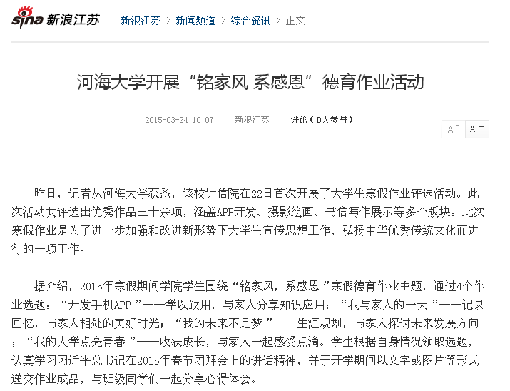 弘扬中华优秀传统文化,创新大学生思想政治教育工作得到新浪江苏报道