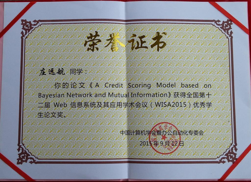 许卓明教授指导的计算机科学与技术专业2013级(学术型)硕士研究生庄远航同学的学术论文《A Credit Scoring Model based on Bayesian Network and Mutual Information》获WISA 2015学术会议“优秀学生论文奖”。该论文已由IEEE Press正式出版。