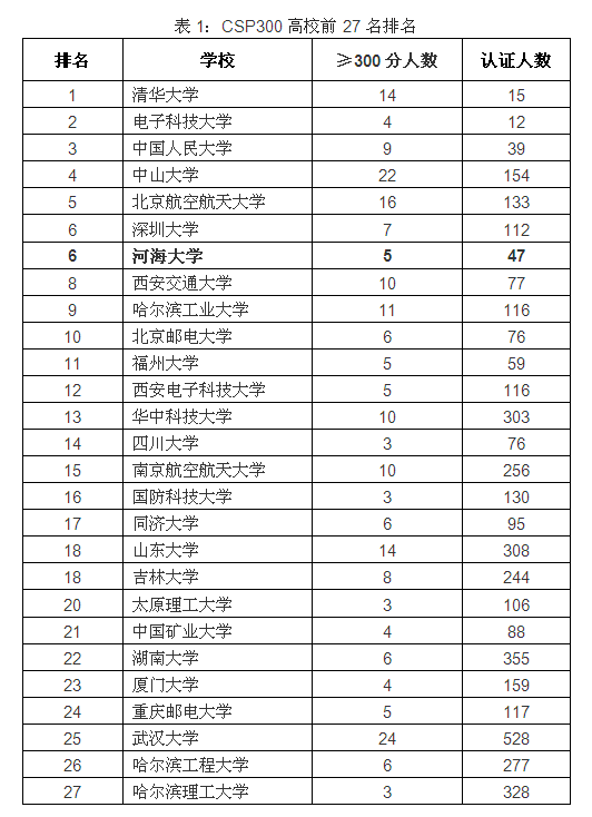 此次认证考试共有来自全国200多高校的6931人参加,满分500分。认证成绩400分以上的有44人,大赢家比分 1人。认证成绩在300分以上且参加认证人数在10人以上的有39所院校,共238人。大赢家比分 排名第6,各校300分以上人数排名(CSP300)(见表1)。