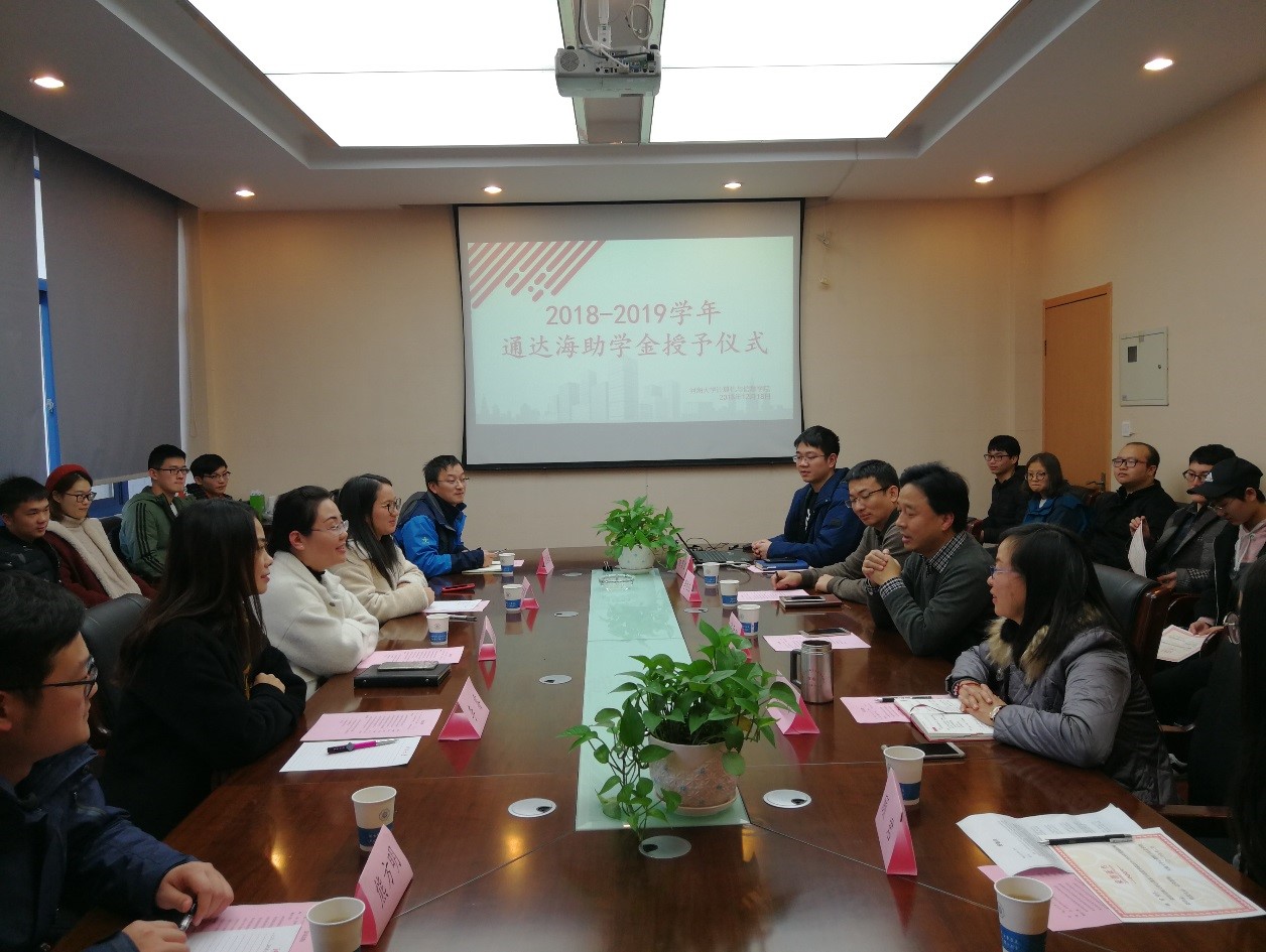 12月18日,大赢家比分 通达海助学金颁奖仪式在勤学楼3305会议室举行。南京通达海信息技术有限公司行政总监徐东惠、总经理助理阮雅珊、人力资源部经理李睿、开发部经理熊方明、开发部高工仇国庆,大赢家比分 计算机与信息大赢家比分 党委书记张雪刚、党委副书记张炜、信息与通信工程系主任李旭杰以及本科生辅导员陈昊迪参加此次颁奖仪式。