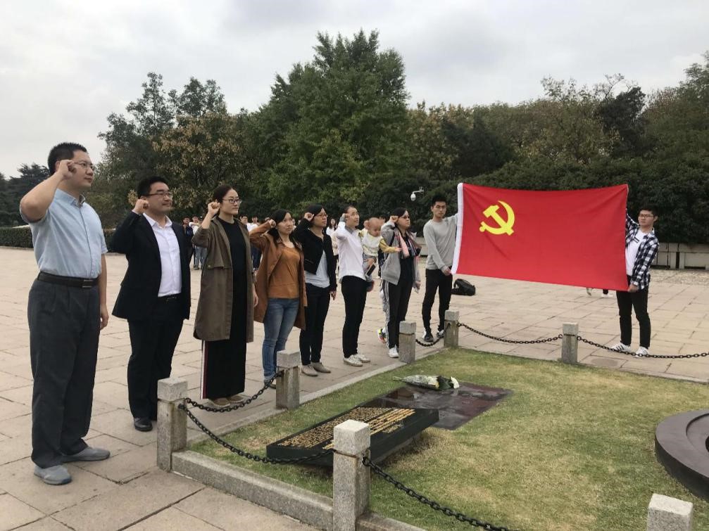 本次活动主要分两部分进行,分别是在纪念碑和党旗下进行宣誓、参观雨花台烈士纪念馆并学习先烈的英雄事迹和精神。支部书记高红民同志带领全体党员进行了庄严的宣誓,重温入党誓词。接着,支部成员集体前往由邓小平同志亲笔题写的“雨花台烈士纪念馆”参观学习,全体党员在纪念馆内认真了解了党的早期领导人邓中夏、恽代英等烈士的生平事迹,并共同重温了战火纷飞的年代,革命先烈的奋斗精神和大无畏的英雄气概让每一位在场的党员倍受鼓舞。最后,支部成员参观了忠魂亭、倒影池、纪念桥等红色纪念建筑。
