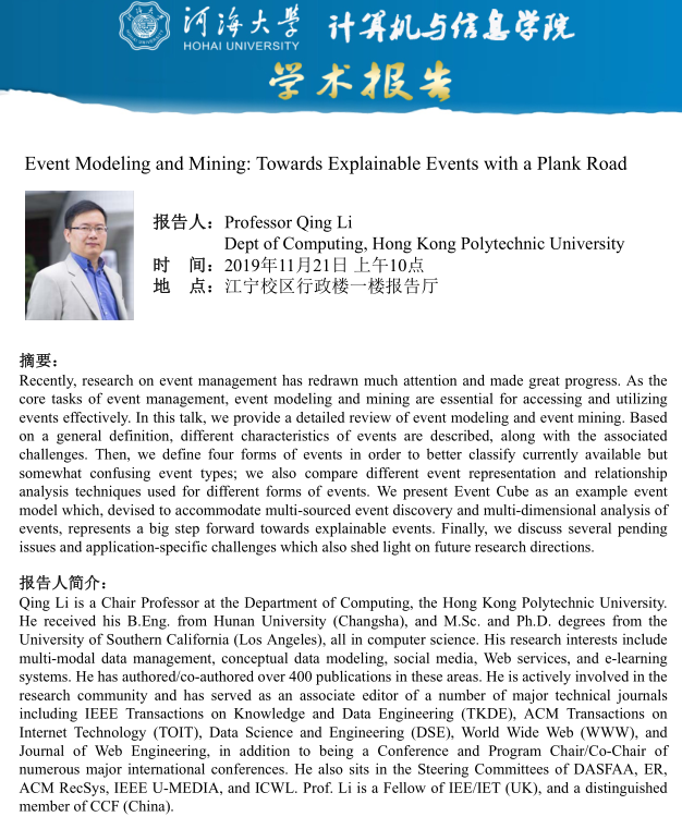 学术报告:Event Modeling and Mining: Towards Explainable Events with a Plank Road