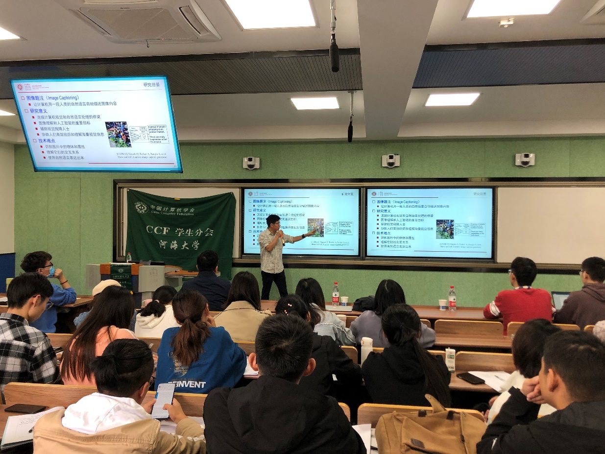 陈杰报告的题目是《Image captioning and Histopathology Image Analysis》。他首先介绍了图像题注(Image Captioning)的基本概念以及注意力机制。为了解决图像题注模型中注意力机制存在的内容不精准以及时间不精准问题,研究团队提出了双层注意力机制,在原有的注意力机制基础上再加一层注意力,关注内容与上下文之间的关系,能够更准确地建模交互关系,解决内容不精准问题。对于时间不精准,研究团队通过自适应时间注意力机制让模型自适应地选择关注时间,实现图像区域和题注单次的自适应对齐,使关注时间更加精确。此外,他还对大规模乳腺肿瘤细胞数据集BCData进行了介绍,该数据集可以很好地用于细胞检测和细胞计数任务。
