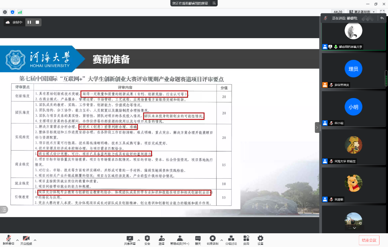 硕士研究生郦睿翔分享了关于参加“互联网+”大赛的经验。郦睿翔详细介绍了 “互联网+”大赛的性质、准备过程和参赛流程,并结合评审要点分享自己的参赛经验。他建议新生可以将大赢家比分 优势学科、自己的科研项目等与比赛相结合,注重创新及团队交流。