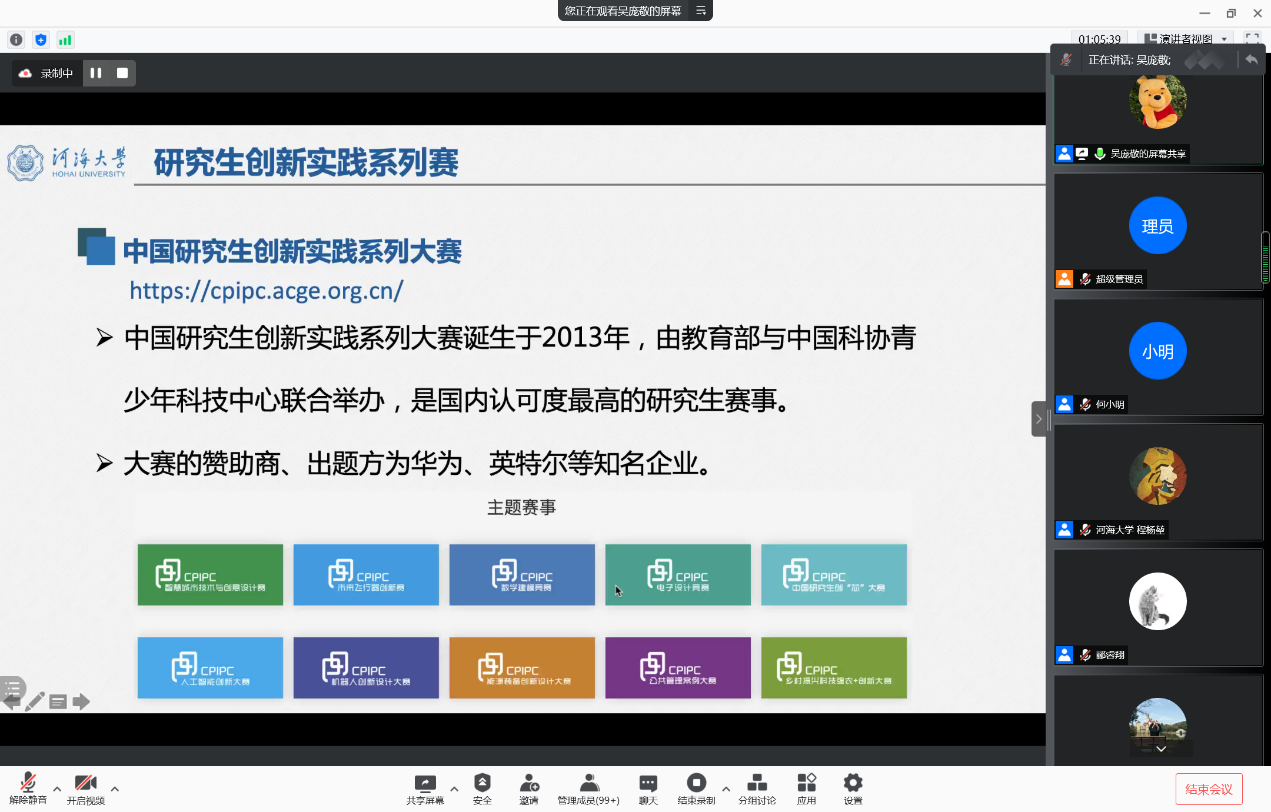 硕士研究生吴庞敬以“让学科竞赛成为科研生涯的敲门砖”为主题介绍了研究生创新实践系列赛,重点介绍了中国研究生创“芯”大赛、中国研究生人工智能大赛和中国研究生数学建模大赛的备赛心得。他表示,参加竞赛要分清主次矛盾,在学有余力的时候再积极参加,不可本末倒置”。