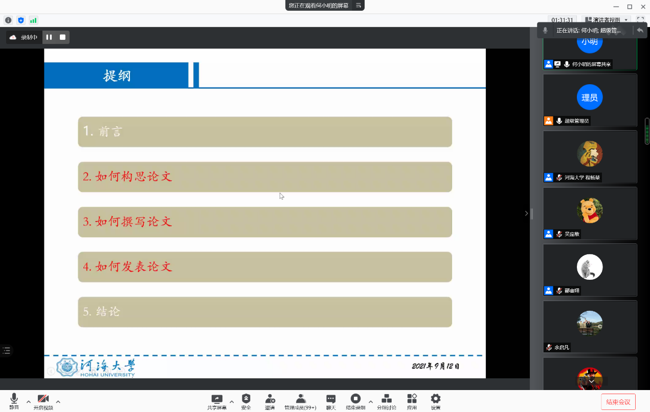 博士研究生何小明从如何构思论文、如何撰写论文及如何发表论文三个方面分享了宝贵的经验。他首先介绍了如何做研究,包括选择研究方向、选择研究课题以及学习领域知识;然后讲解了高水平论文的方法与技巧;最后就如何选期刊或者会议投稿、稿件处理等与同学们做交流,对同学们提出的问题做一一解答。