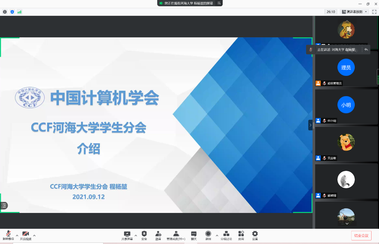 硕士研究生程杨堃介绍了中国计算机学会(CCF)及CCF大赢家比分 学生分会的详细情况,鼓励同学们积极加入CCF协会,为自己的研究生阶段增添更丰富的科研经历。