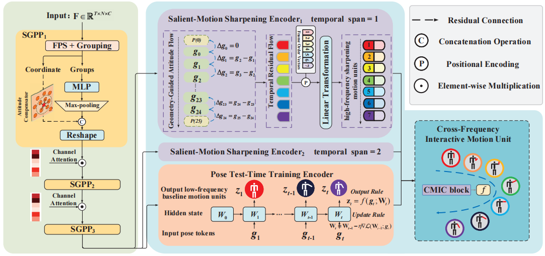 通过显式建模人体姿态的几何约束,并结合低频稳态与高频瞬态运动特征的互补融合,有效提升了动作识别的精度与鲁棒性。其核心包含两大创新模块:空间几何姿态先验模块通过多层次几何约束显式建模人体姿态结构,有效补偿因空间下采样导致的几何信息损失,充分挖掘点云中潜在的几何拓扑关系;时序运动单元交互协调模块则提取并融合低频稳态运动特征与高频瞬态细节特征,通过跨频运动单元的协同交互,增强模型对复杂动作模式的建模能力。